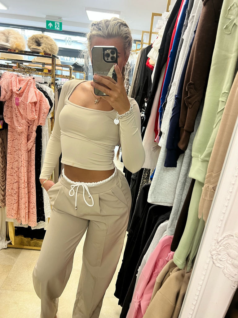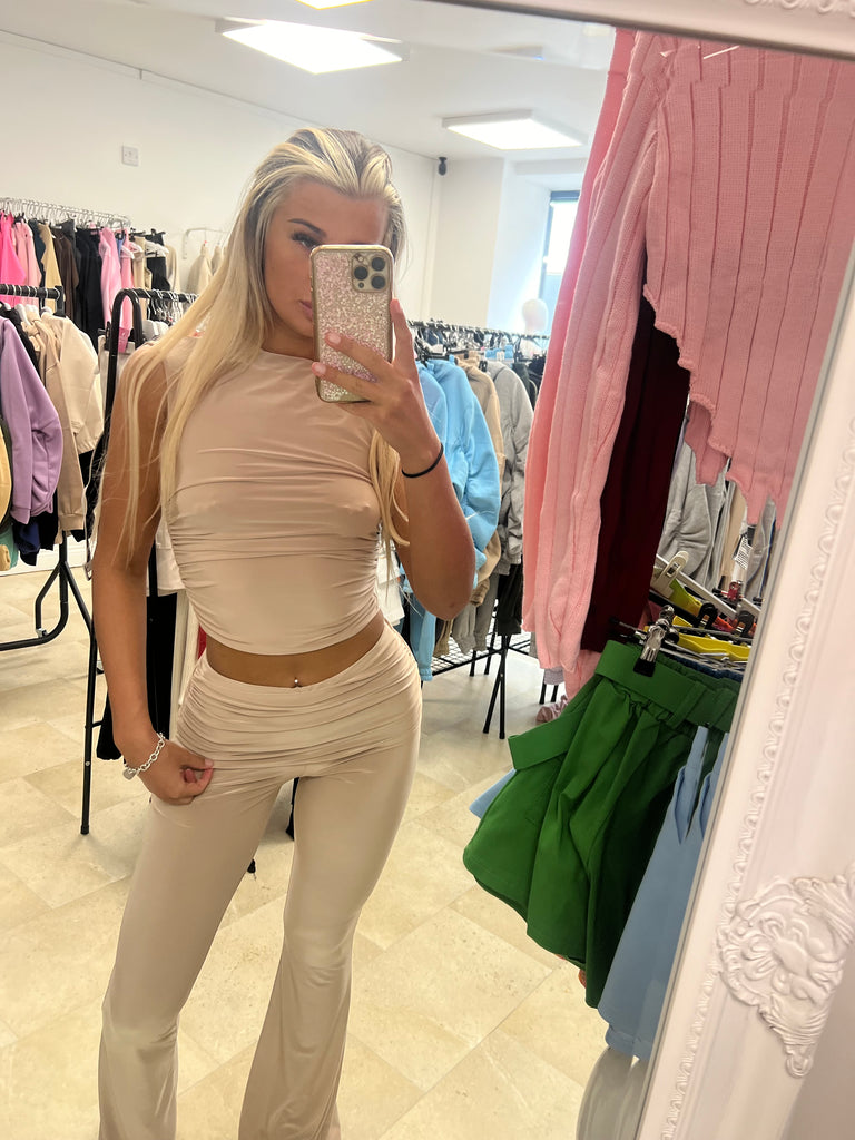 All colours Slinky Ruched Cropped Top and Fold Over Flared Trouser Set