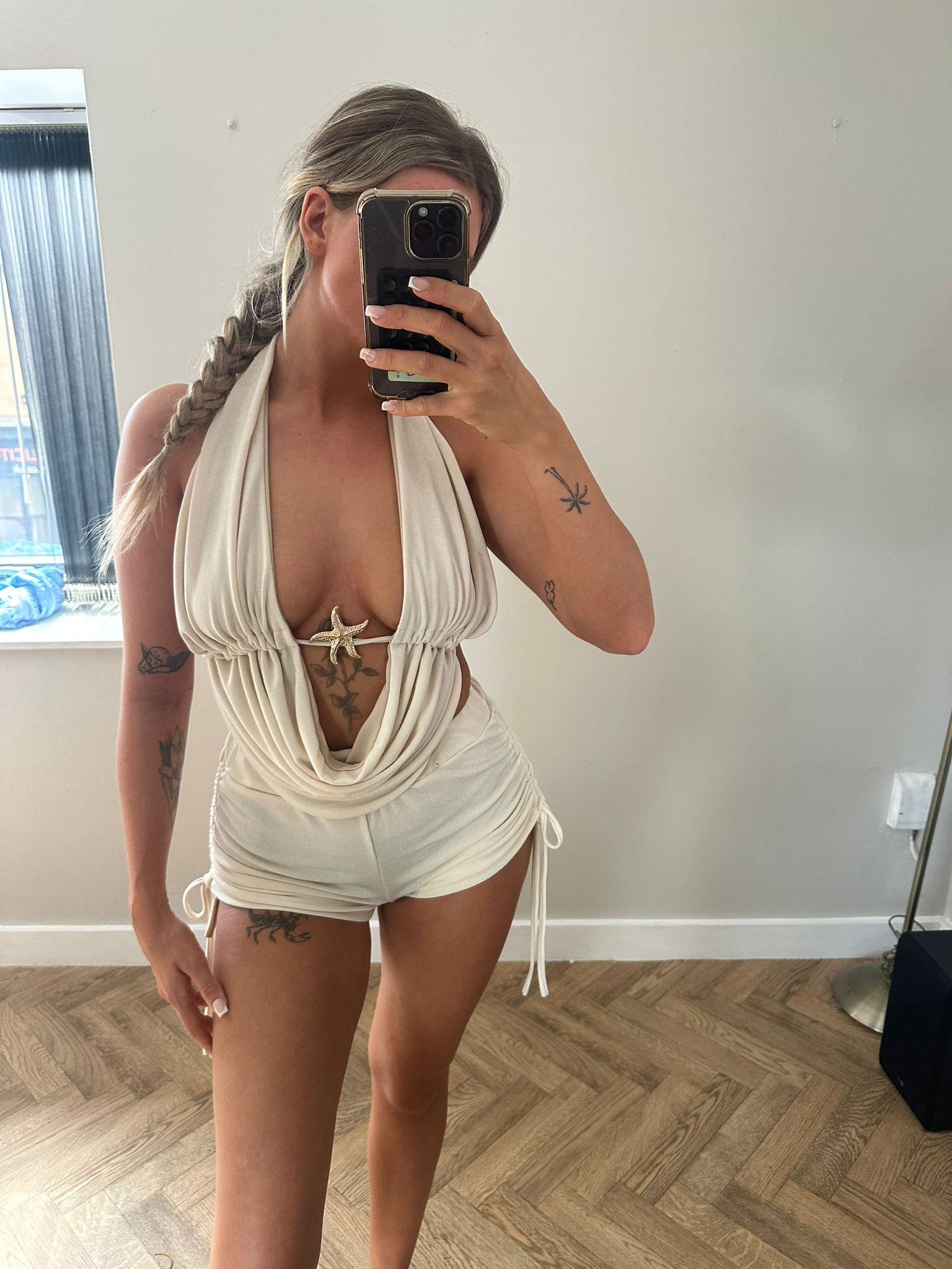 Starfish Halter-Neck Crop Top & Shorts Co-ord    Side Ruched                                                         Adjustable Fasten Halter Neck                                  Crop Top                                                                  Ruched Shorts                                                     Coordinate Set